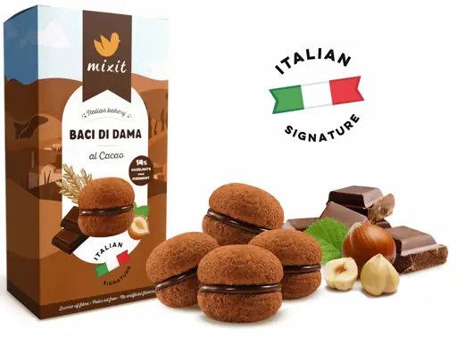 Posledných 5 kusovLa Dolce Vita! Z našej lásky k Taliansku a krehkému pečivu vznikli Cookie Baci di Dama al Cacao – dve jemné kakaové sušienky spojené krémom z horkej čokolády. Nájdete v nich len poctivé suroviny – obsahujú 14 % lieskových orieškov a kvalitné kakao. Samozrejmosťou je, že sú bez palmového oleja aj umelých aróm. Vďaka maslovému cestu a vláčnej čokoládovej náplni sa doslova rozplývajú na jazyku – ideálne ku káve, na piknik alebo len tak pre radosť. Stačí jediné sústo a ocitnete sa v talianskej cukrárni pod piniami.