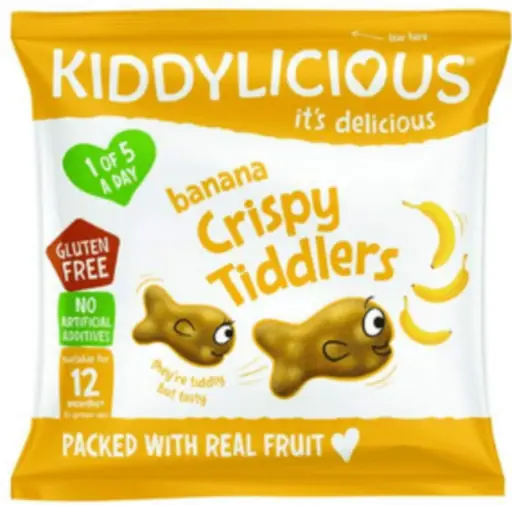 Banánové rybičky Kiddylicious sú dokonalou a zdravou sladkosťou. Sú vyrobené z pravého ovocia a ovocnej šťavy, načo sa táto zmes rozmixuje s chrumkavými kúskami ryže a vytvaruje do rozkošného tvaru rybičiek. Sú chutnou alternatívou ku gumovým medvedíkom. Ideálne aj na ozdobu koláčov, sušienok a dezertov. Tieto chrumkavé rybičky obsahujú iba prirodzene sa vyskytujúce cukry.