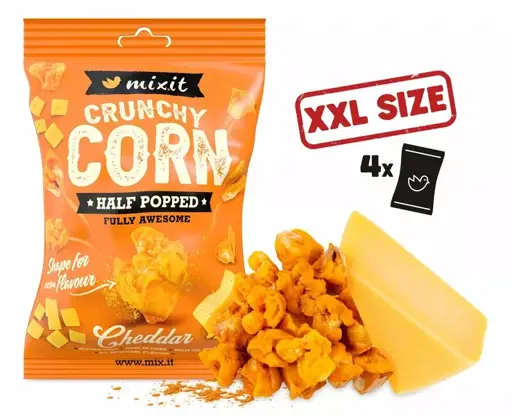 Zloženie celé zrná kukurice 73 %, sójový olej, koreniaca zmes so syrom 6,5 % [sušená srvátka, maltodextrín, repkový olej, syr cheddar v prášku 7 % (pasterizované mlieko, mliekarenské kultúry, jedlá soľ, mikrobiálne syridlo), prírodná aróma, jedlá soľ, prírodné farbivo: extrakt z annatta; paprika, kurkuma; emulgátor: fosforečnan sodný; regulátor kyslosti: kyselina citrónová, kyselina mliečna; protihrudkujúca látka: oxid kremičitý]