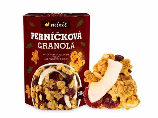 Zloženie celozrnné ovsené vločky 19 %, kľukva 15 % (kľukva velkoplodá - "brusnica kanadská", cukor, slnečnicový olej), mini sušienky s perníkovým korením 15 % [pšeničná múka, cukor, kokosový tuk, karamelový sirup, kypriaca látka: uhličitany sodné; korenie 0,6 % (kardamóm, koriander, klinček, nové korenie, muškátový oriešok), prírodná perníková aróma, jedlá soľ, pšeničný škrob, regulátor kyslosti: kyselina citrónová], ryžový sirup, kokosové plátky 10 %, sušené jablká 10 %, arašidový jemný krém (100 % pražené lúpané arašidy), mandle plátky 5,7 %, slnečnicové semienka, repkový olej, zmes vianočného korenia 0,5 % (cejlónska škorica, klinček, badián)