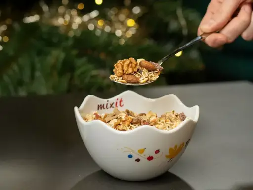 Posledné 3 kusyDoprajte si na raňajky voňavú müsli zmes sušeného ovocia, čokolády a orieškov doladenú škoricou, klinčekom a badiánom. Pridali sme kukuričné lupienky v mliečnej a bielej čokoláde pre dobrú náladu a ovsené lupienky s vlákninou pre spokojné bruško. Je to náš historicky najpredávanejší mix, tak na ňom asi niečo bude. :-)